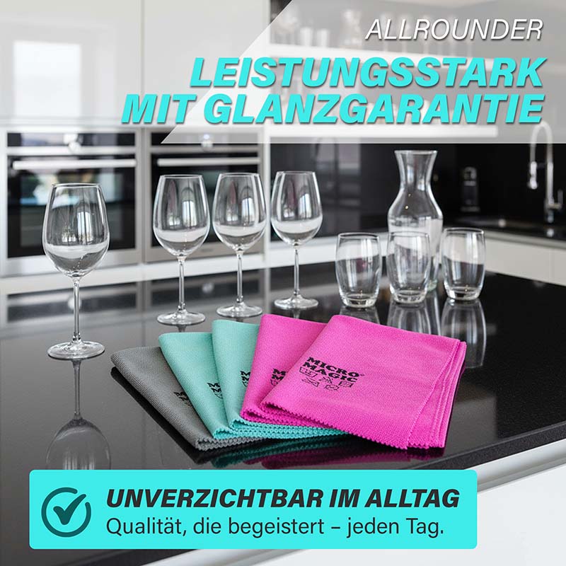 Ob als Glastuch, Trockentuch oder Putztuch – die Micro Magic Poliertücher sorgen für strahlende Ergebnisse auf allen glatten Flächen: Glas, Fenster, Spiegel, Edelstahl, Armaturen oder Hochglanzfronten. Auch Laptop, Smartphone, Tablet oder TV werden mit diesen Mikrofasertüchern streifenfrei sauber.