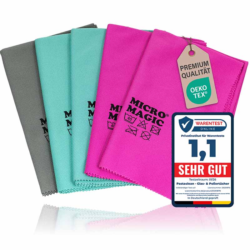 Wenn Glas, Fenster, Spiegel oder Edelstahl streifenfrei glänzen sollen, kommen die Pastaclean Micro Magic Poliertücher ins Spiel. Die Mikrofaser-Tücher sind super saugstark, fusselfrei und ideal für Chromarmaturen, Duschkabinen, Ceranfelder, Fliesen und Hochglanzküchen. Auch im Auto, am Motorrad oder beim Laptop, Smartphone, Tablet und TV-Bildschirm sorgen sie für klare Sicht. Selbst Weingläser, Brillen oder Musikinstrumente lassen sich perfekt polieren. Waschbar bis 60 °C, langlebig und TV-bekannt – Glanz ohne Kompromisse.