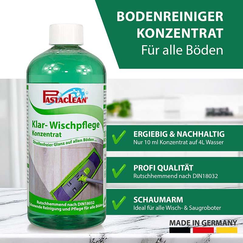 Durch das Polieren wird der Glanz Ihres Bodens noch strahlender! Keine Schlieren mehr, nur noch ein makelloser, streifenfreier Glanz. Mit der Pastaclean Klar- und Bodenwischpflege wird Ihr Boden nicht nur tiefenrein, sondern erhält auch einen erfrischenden und sauberen Duft. Zusätzlich ist die Wischpflege rutschhemmend und entspricht den Anforderungen der DIN18032. Das schaumarme Produkt eignet sich sogar für den Einsatz in Reinigungsautomaten. Vergessen Sie mühsames Bodenwischen - Erleben Sie mit Pastaclean die ultimative Reinigungserfahrung!