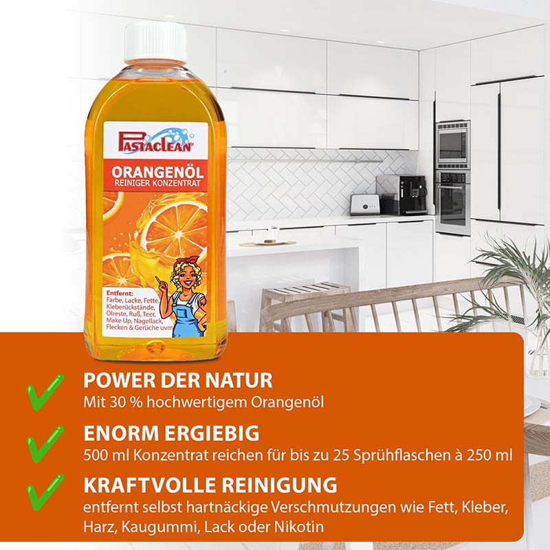 Das Pastaclean Orangenreiniger-Konzentrat bringt Glanz in Küche, Bad und Haushalt – mit der natürlichen Reinigungskraft der Orange. Aus 500 ml Konzentrat mischst du bis zu 25 Liter gebrauchsfertige Lösung und sagst selbst hartnäckigem Fett, Öl, Kleber, Etiketten, Harz, Kaugummi, Nikotin, Lack- & Make-up-Reste den Kampf an. Ob Herd, Dunstabzug, Fliesen, Fenster, Badkeramik oder Küchenschränke – dieser Alleskönner packt’s an und hinterlässt streifenfreie Sauberkeit mit frischem Orangen Duft.