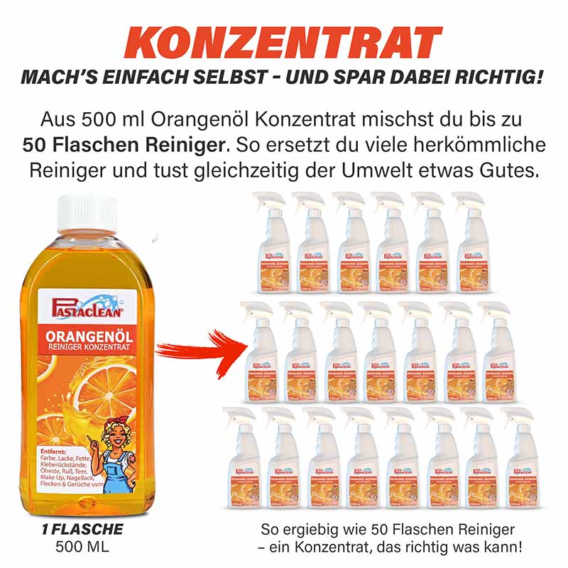 Der Pastaclean Orangenöl Reiniger ersetzt zudem so manchen anderen Spezialreiniger. Ob Kaugummi, Harze, Fette, Klebereste oder sogar Lippenstift- dieser Reiniger ist vielseitig einsetzbar und bewältigt mühelos selbst die hartnäckigsten Verschmutzungen. Und das Beste daran: Er ist äußerst sparsam in der Anwendung! Mit einer Flasche Konzentrat (500 ml) kannst Du bis zu 50 Sprühflaschen à 250 ml füllen.