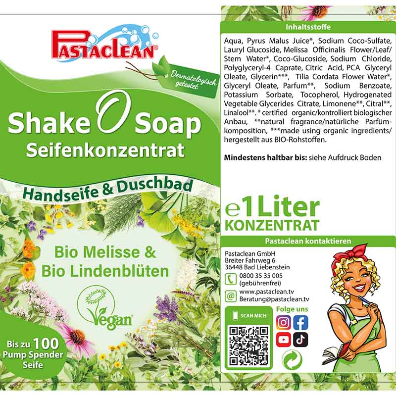 Shake O Soap ist dermatologisch getestet. Das Seifenkonzentrat ist vegan und schonend hergestellt aus hochwertigen Rohstoffen und Pflanzen-Extrakten. Eine erlesene Duftkomposition aus Bio-Zitronenmelissen- und Bio-Lindenblütenextrakt verwöhnt Sie beim Hände waschen und duschen. Einer toller Duft für Sie und Ihn.