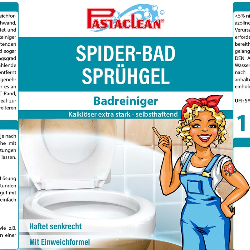 Das Spider-Bad Sprühgel von Pastaclean ist ein Problemlöser mit Einweichformel, der senkrecht auf Sanitärkeramik, Fliesen, Duschkopf, Duschwand, Armaturen, Seifenschalen, Duschablagen, WC oder Waschbecken haftet und selbständig arbeitet. Der Spider-Bad ist ein konzentrierter und starker Reiniger und Kalklöser für das gesamte Badezimmer. Dank seiner selbsthaftenden Formel lässt er sich ganz einfach auftragen und haftet senkrecht und sogar über Kopf an allen Oberflächen im Bad.
