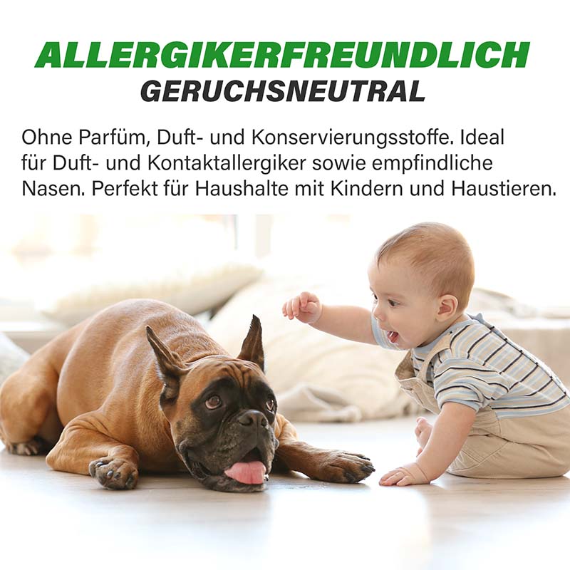 - Geruchsneutral & allergikerfreundlich: Parfümfrei und ohne Konservierungsstoffe – ideal für Duft- und Kontaktallergiker sowie empfindliche Nasen. Perfekt für Haushalte mit Kindern und Haustieren.