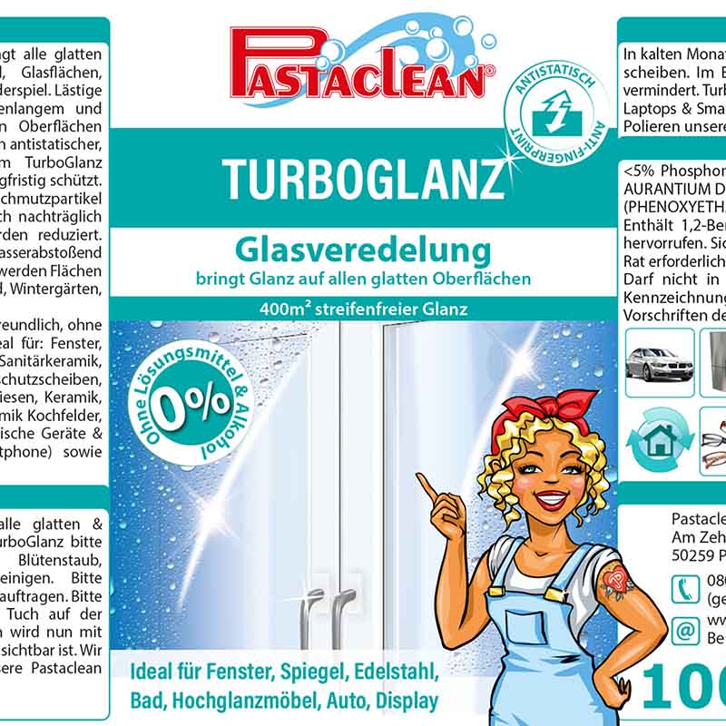 TurboGlanz ist eine Veredelung, ein Finish und bringt alle glatten Oberflächen wieder auf Hochglanz. Fenster, Spiegel, Glasflächen, Edelstahl und Hochglanzmöbel reinigen wird zum Kinderspiel. Lästige Schlieren, Streifen und Fusselbildung nach stundenlangem und mühevollem polieren sensibler und empfindlichen Oberflächen gehören mit dem TurboGlanz der Vergangenheit an.
