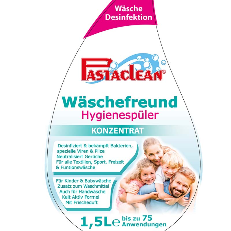 Das Pastaclean Hygienespüler Konzentrat ist die hygienische Lösung für Niedrigtemperatur Wäsche. In der heutigen Zeit können Kleidungsstücke oft nur noch bei niedrigen Temperaturen z.B. bei 30°- 40°C gewaschen werden. Dadurch ist die Gefahr groß, dass Krankheitserreger, Pilze oder geruchsbildende Bakterien bei niedrigen Temperaturen in der Wäsche verbleiben und durch das Waschen von einem Kleidungsstück zum anderen übertragen werden. Die Vermehrung der Bakterien wird dadurch begünstigt und Familienmitglieder können sich anstecken oder immer wieder neu infizieren. Das Abheilen z.B. von Pilzinfektionen, Erkältungen oder anderen Krankheitserregern wird dadurch erschwert.