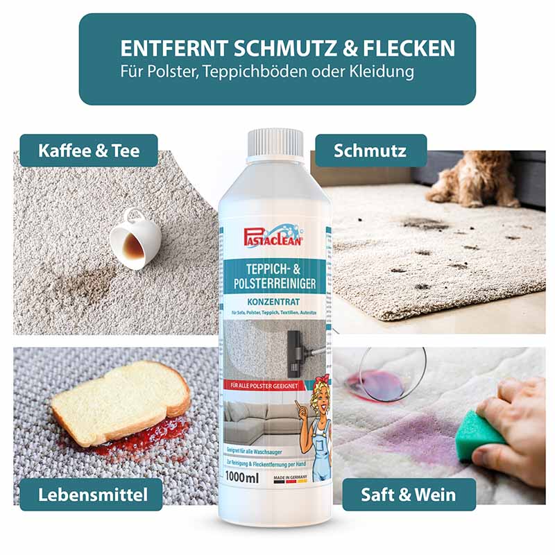 ➡️ Entferne Flecken mühelos mit Pastaclean Teppich & Polsterreiniger! Ideal für Textilien aller Art - Jetzt bequem online kaufen!