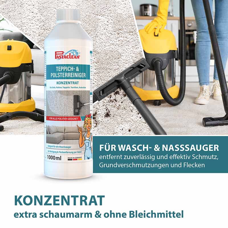 - 💧 Konzentrat - effektiv & ergiebig - Der Pastaclean Teppich & Polsterreiniger ist ein hochkonzentrierter Reiniger – individuell mit Wasser verdünnbar. Ideal für die Fleckentfernung per Hand oder als Zusatz für den Waschsauger.