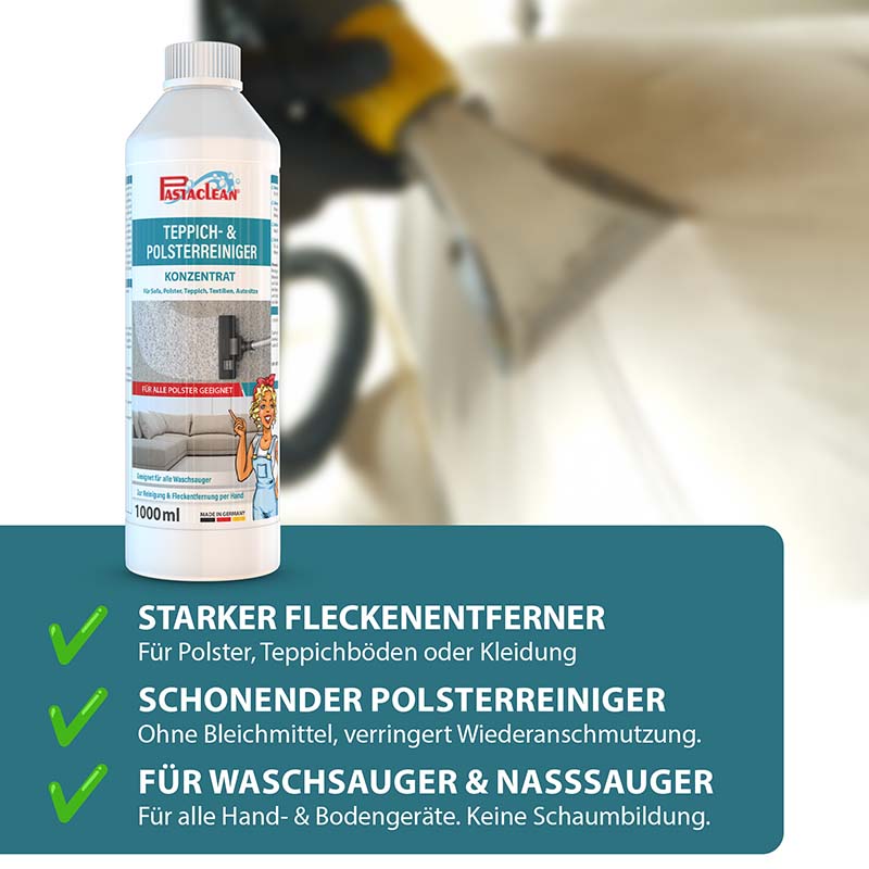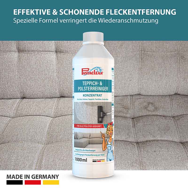 - 💧 Konzentrat - effektiv & ergiebig - Der Pastaclean Teppich & Polsterreiniger ist ein hochkonzentrierter Reiniger – individuell mit Wasser verdünnbar. Ideal für die Fleckentfernung per Hand oder als Zusatz für den Waschsauger.
